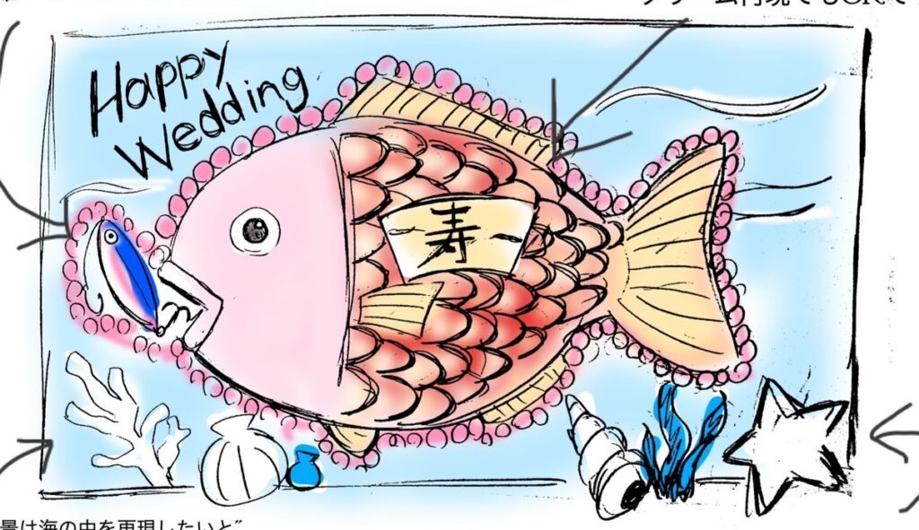ケーキ登場は、新郎様愛用の釣り竿で「めで鯛ケーキ」を釣り上げる演出を取り入れました。