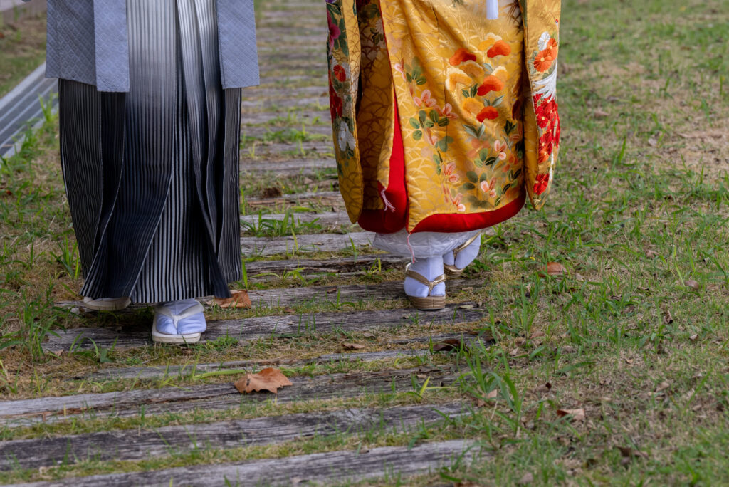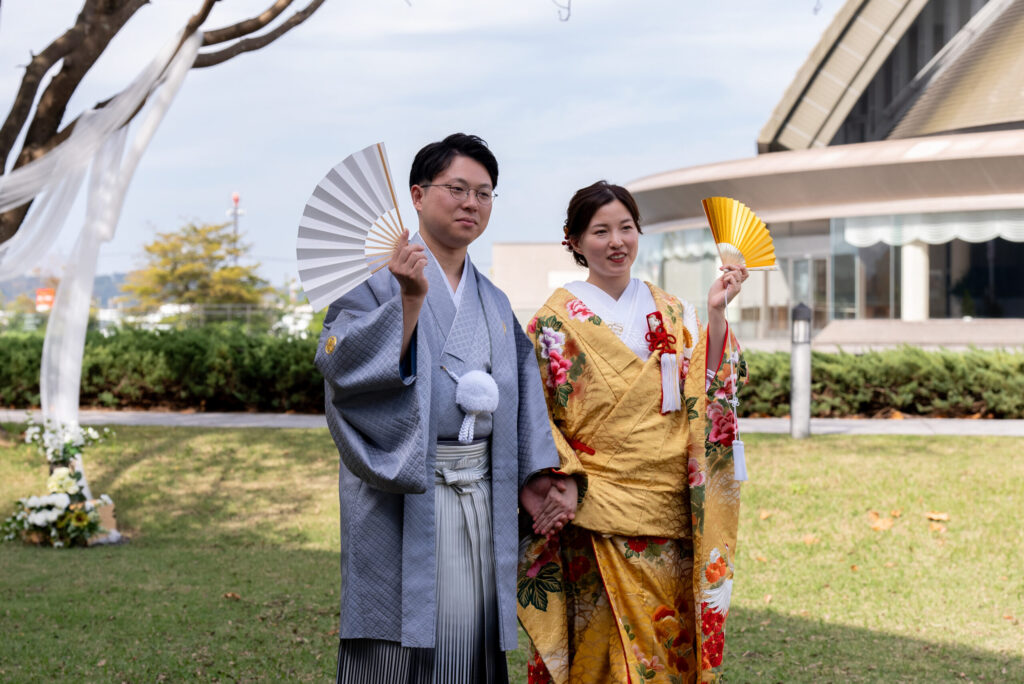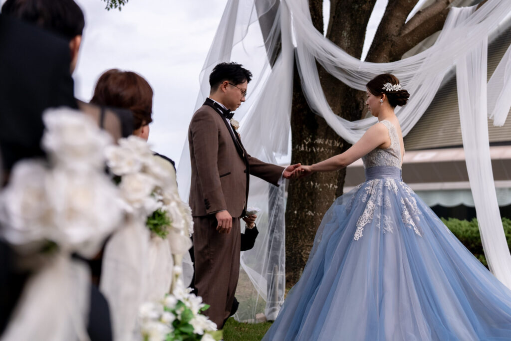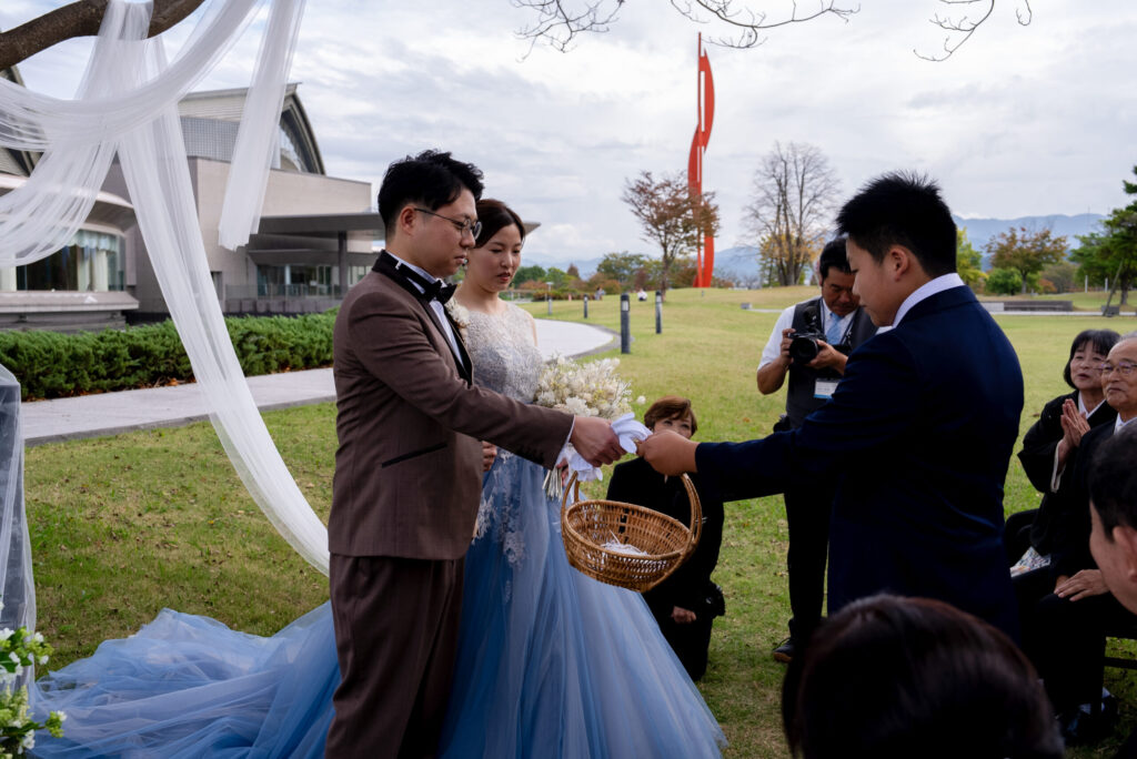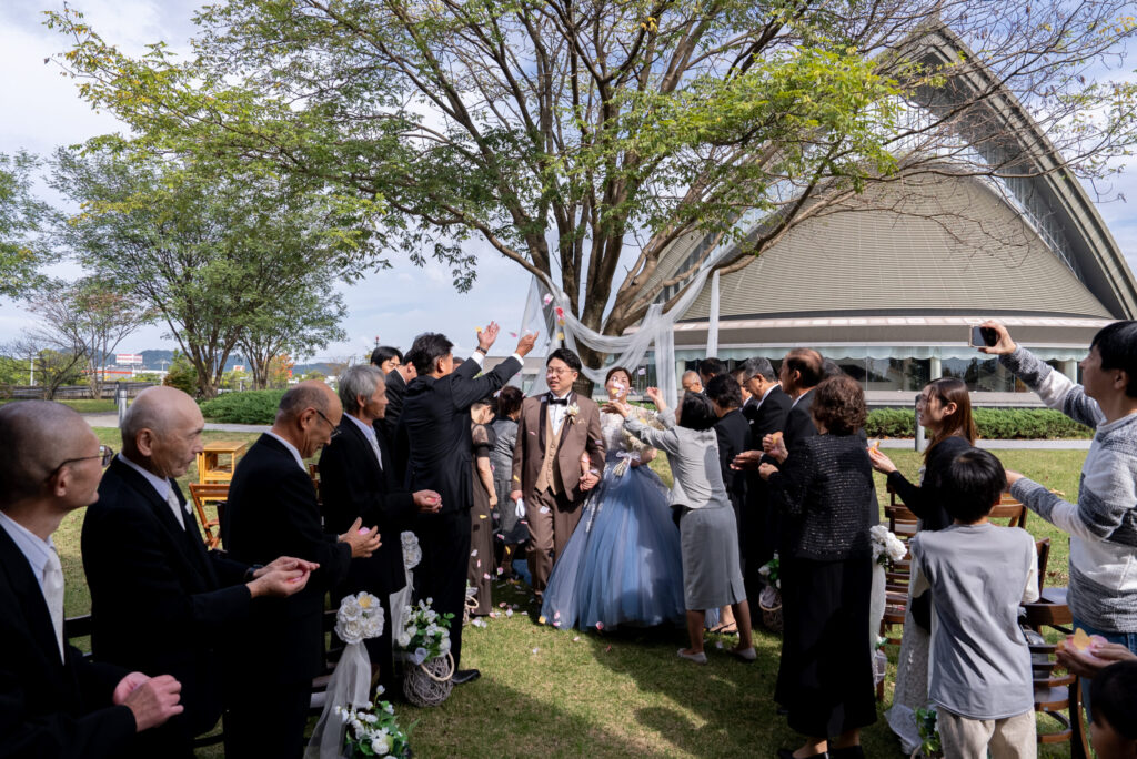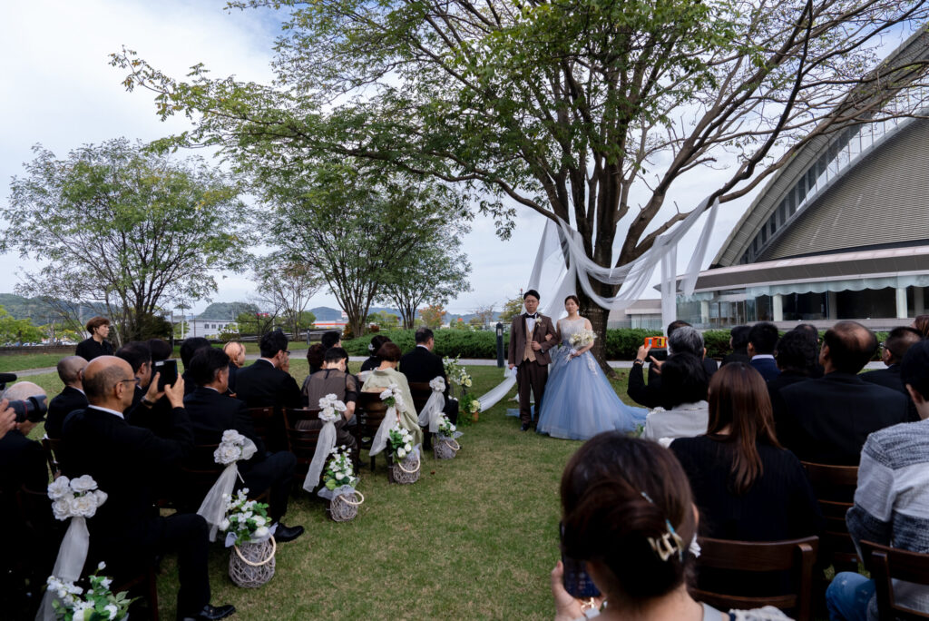 澄み渡る青空の下、ハーモニーホール福井内の美しいガーデンで人前式。