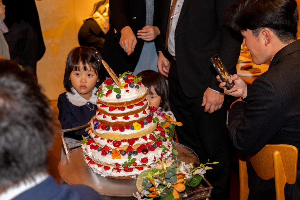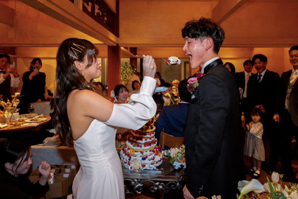 パーティーの中盤には、新郎新婦がデザインしたオリジナルウェディングケーキが登場。