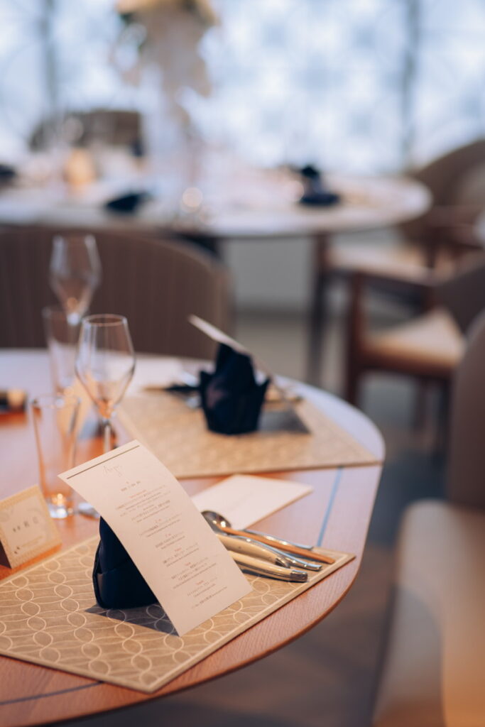 店内は 足羽川の川面に浮かぶ桜の花びらの重なりをイメージした越前和紙をあしらった装飾や、店名に由来する「桜樹(おうじゅ)」を思わせるダイニングチェアなど、福井の文化と誇りをデザインに取り入れた洗練された空間。